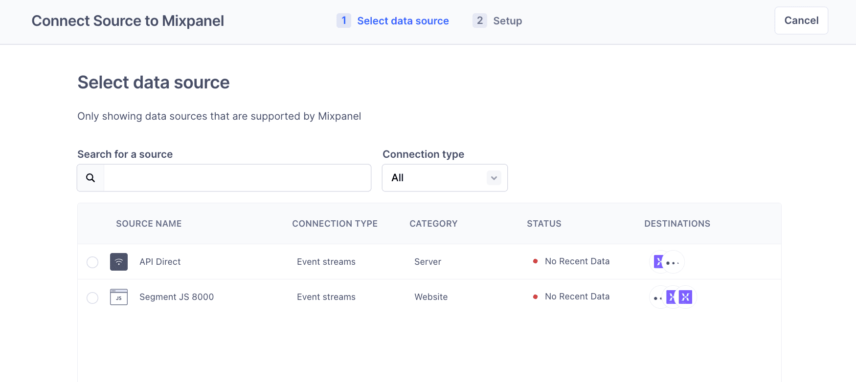 Mixpanel is one of the supported Segment destinations. With this integration, you can easily send your data collected from your Segment source into your Mixpanel project as a downstream destination.
